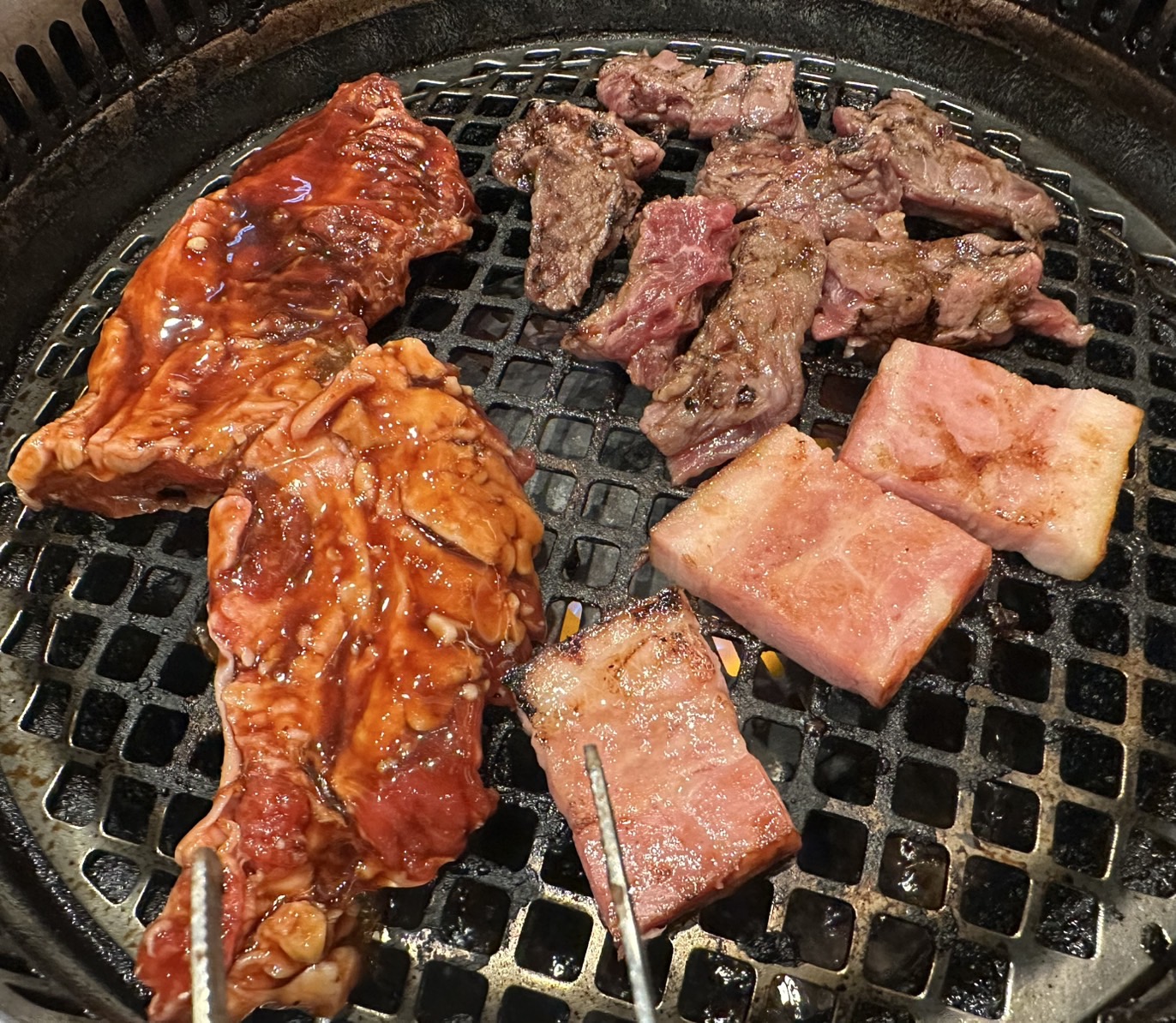 筆者のテーブルは塗装スタッフさんがお肉を焼いてくださっていました(o_ _)o))
