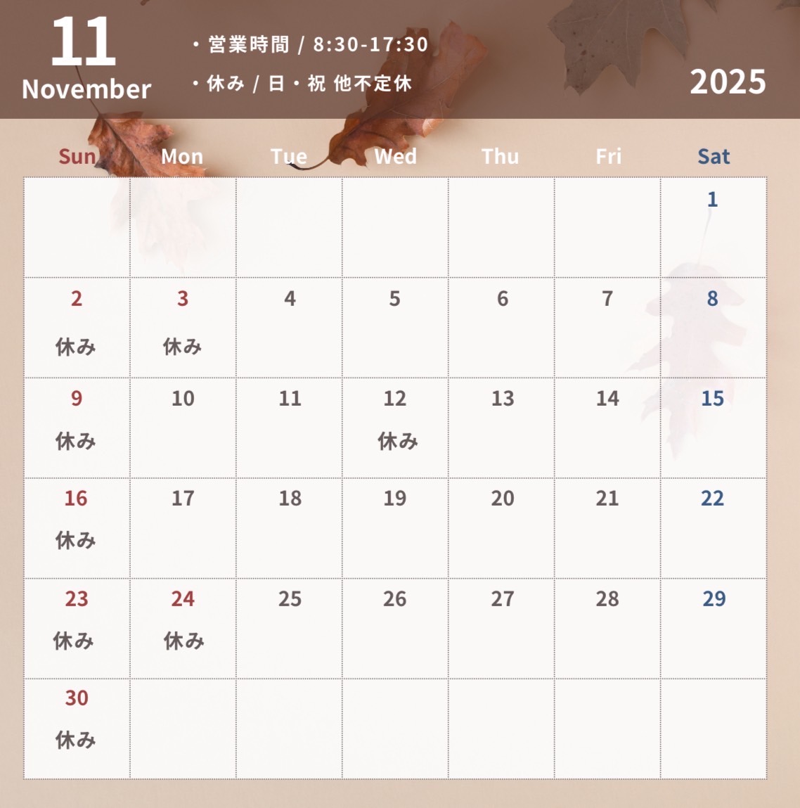 11月の営業日カレンダーになります📢